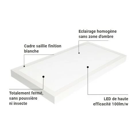 dalle led encastré ultra-fin de 120×60 cm et 72W de puissance, avec kit en saillie inclus. Conception mince, haute intensité lumineuse de 6100 lumens. Parfait pour une installation dans les plafonds avec des plaques amovibles, en remplacement des anciens luminaires à 4 tubes de 120 cm. Kit en saillie inclus, avec tous les accessoires pour une installation facile et rapide. Faible UGR19. Dimensions 1195×595 mm. Drivers LIFUD de haute qualité. Angle d’ouverture de 160 degrès.